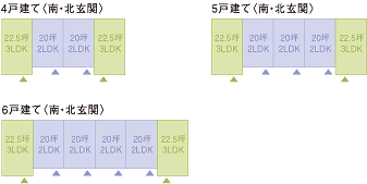 ●各タイプ共に、角住戸は3LDK(22.5坪)を実現。中住戸も2LDK(20坪)の広さを確保。